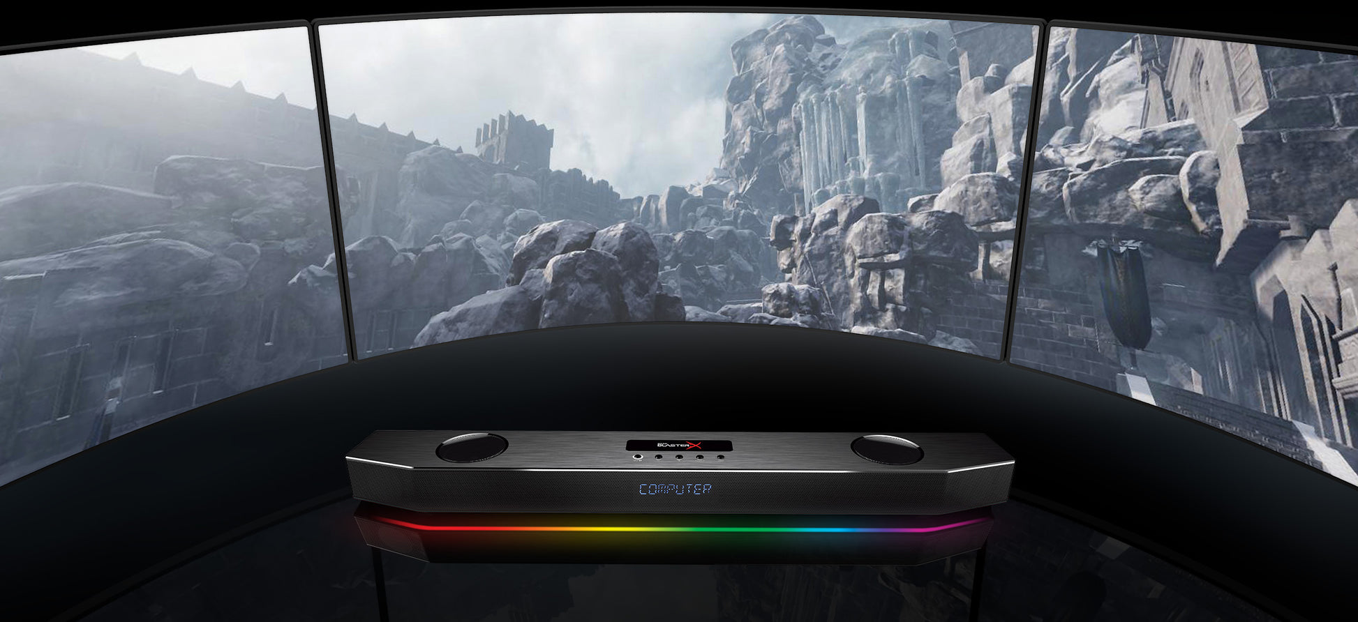 Named after the sword so technologically perfect in structure and so demanding in its creation, the Sound BlasterX Katana exhibits the same sleek sophistication and formidable strength in its design and audio prowess. In a league of its own, the Katana fits right under your monitor with a slimness that's unmatched by other so-called gaming “sound bars”, and is powered and enhanced by our award winning multi-core audio DSP making it the world's first true Under Monitor Audio System (UMAS). In addition, the Sound BlasterX features the Aurora Reactive lighting system, a series of 49 programmable LED lights lined from edge to edge of the Katana chassis, making it the perfect addition to fully optimize and customize your PC and desktop setup.